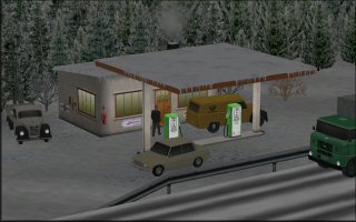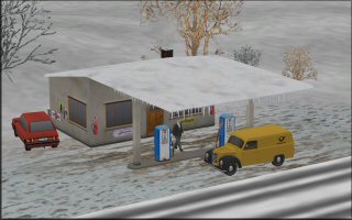Alte Tankstelle in Winterversion für den Stadtrand oder ländliche Gebiete, im