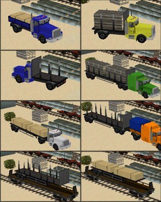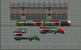 Ein Set mit LKWs, Containerwagen und Gabelstaplern für die Gummifabrik. Darin enthalten sind: