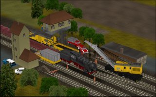 "Deutschen Reichsbahn", sowie zwei dazu passende Begleitwagen und ein Schutzwagen. Der Kran verfügt